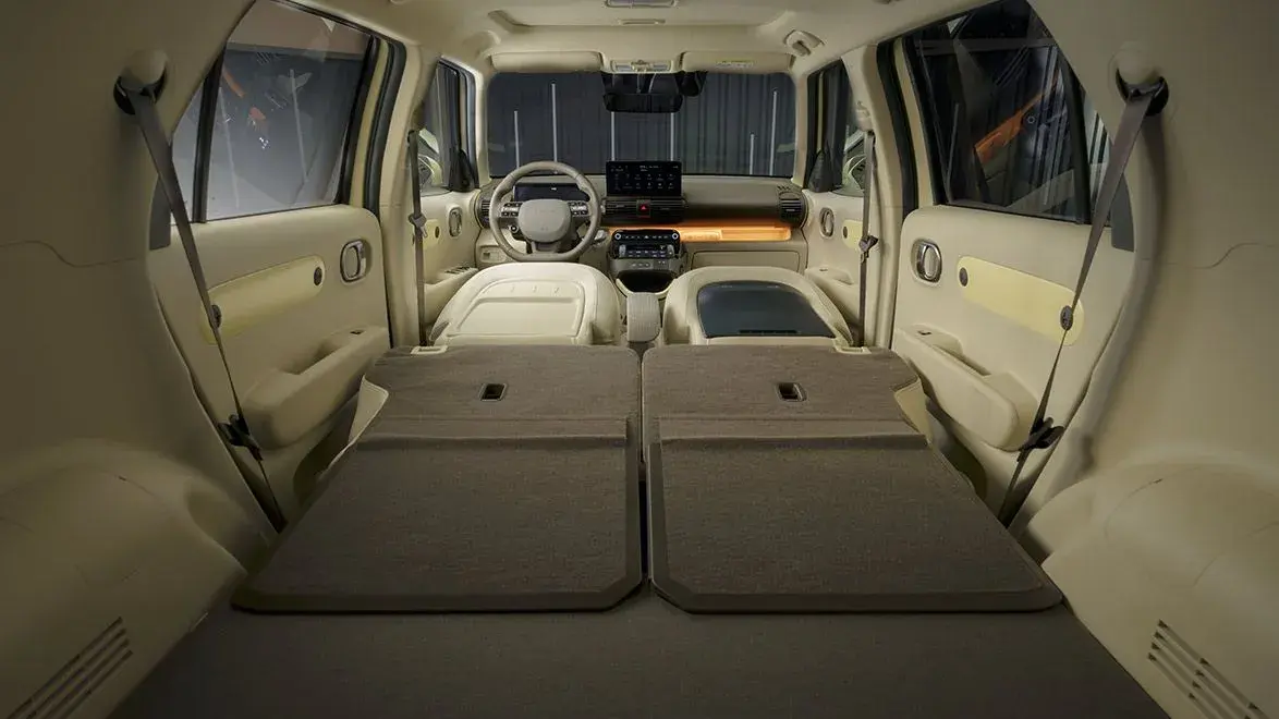 Het interieur van de Hyundai INSTER is zeer veelzijdig, met een ruime toegang tot de voorste zitrij. Schuif de stoelen achterin naar voren om meer bagageruimte te creëren, of schuif een stoel naar achteren voor meer beenruimte. Alle stoelen, inclusief de bestuurdersstoel, kunnen worden neergeklapt voor extra flexibiliteit. Verwarmbare voorstoelen en een verwarmbaar stuur zijn optioneel. De rugleuningen op de tweede zitrij kunnen in de verhouding 50:50 worden neergeklapt en de stoelen achterin zijn behalve verschuifbaar ook kantelbaar.