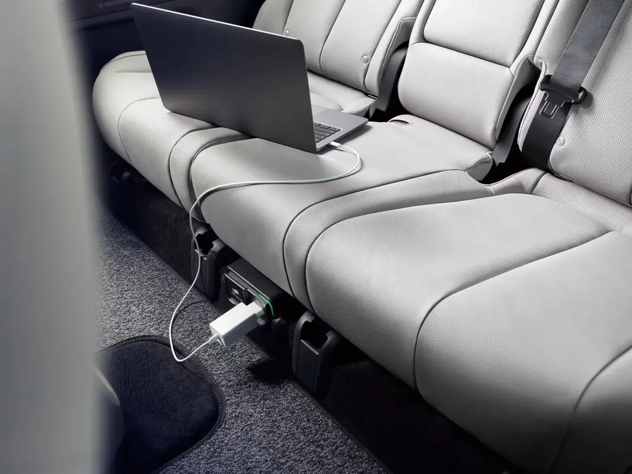 Met de Vehicle-to-Load-technologie (V2L) van de IONIQ 5 kun je elk apparaat van stroom voorzien. De V2L-aansluiting in het interieur bevindt zich onder de tweede zitrij en heeft een vermogen van 3,6 kW.